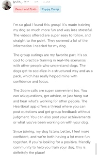 When your dog goes home, the support doesn’t stop. You’ll get one-on-one coaching, a clear training plan, and ongoing support through our online community so you know exactly how to keep the results long-term.